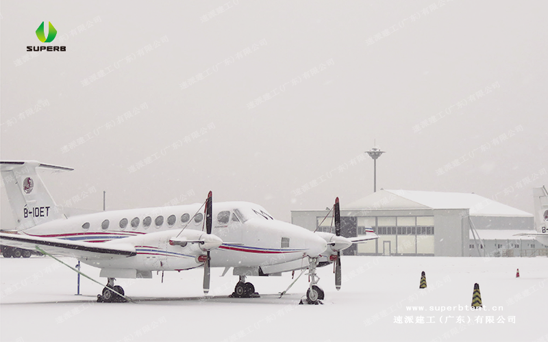层叠推拉门停机篷是一种高效、可靠的航空设备保护设施,专为固定翼飞机和直升机的存储和保护设计。它具有优异的抗雪性能,能够有效承受积雪重量,避免篷房因积雪过多而塌陷。同时,篷房的保温功能出色,能够在寒冷环境中保持稳定温度,确保飞机在极端天气条件下的正常使用。速派建工篷房材料经过特殊处理,具备抗高温能力,能够抵御烈日暴晒,防止高温对飞机及设备造成损害。它不仅能够有效保护飞机免受外界天气影响,还能为飞机提供一个干燥、通风的环境,延长其使用寿命。固定翼机库篷房的搭建快捷灵活,适应性强,是航空行业理想的飞机保护设施。
